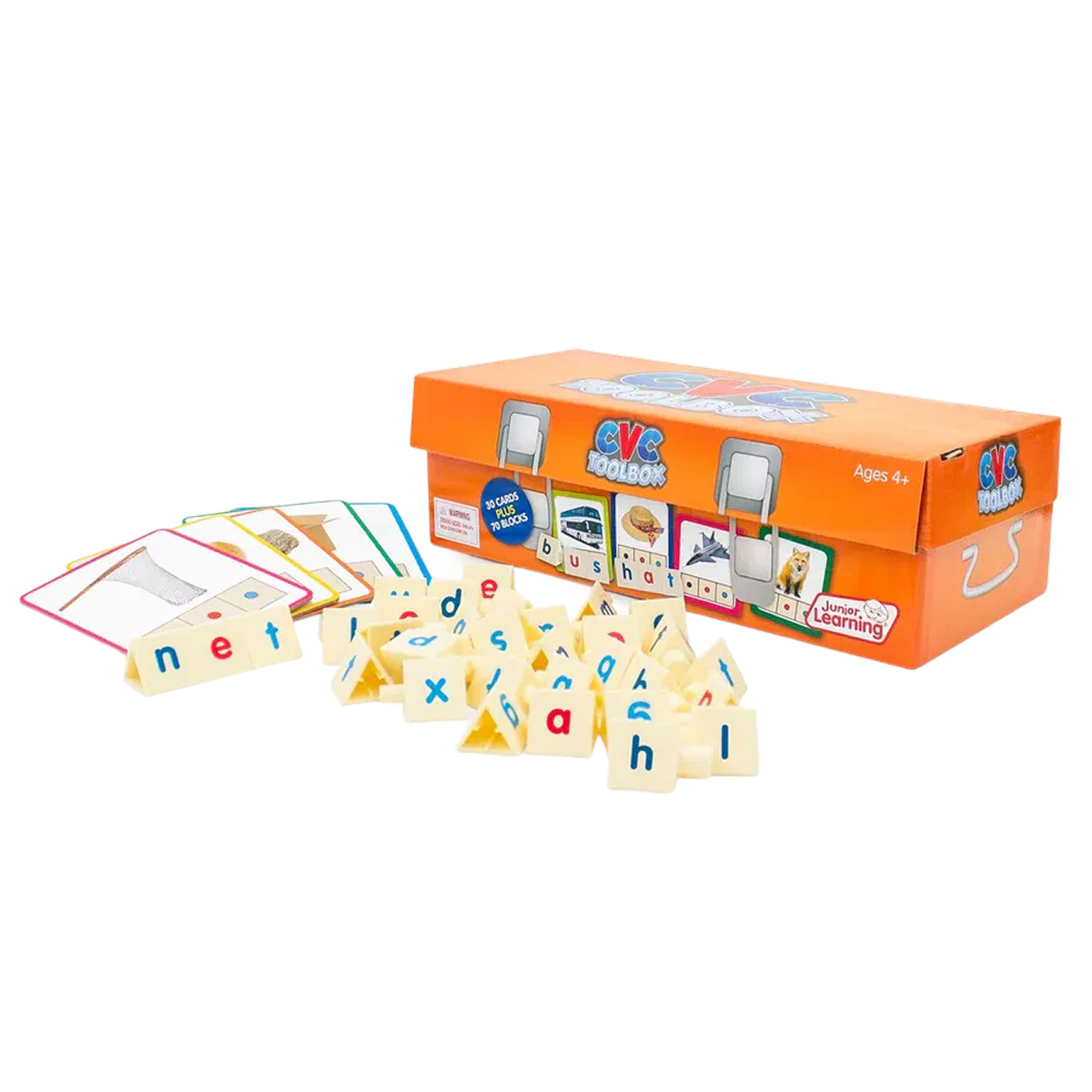 The CVC Toolbox is a handy tool for building CVC words. It contains 70 tri-blocks covering beginning, middle and final sounds as well as 30 word building cards with real photography.