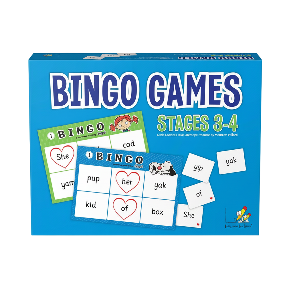 Bingo Games Stages 3–4 give children lots of practice reading consonant-vowel-consonant (CVC) words using the phonemes and graphemes they have learned in Stages 3 and 4 of the Little Learners Love Literacy® sequence—y r e qu z j u k x w.