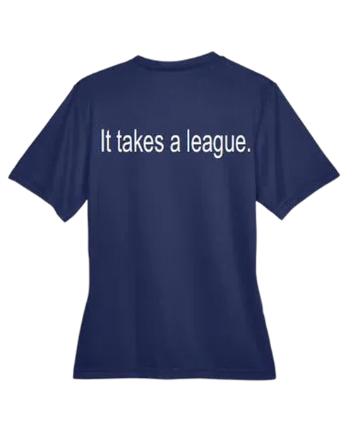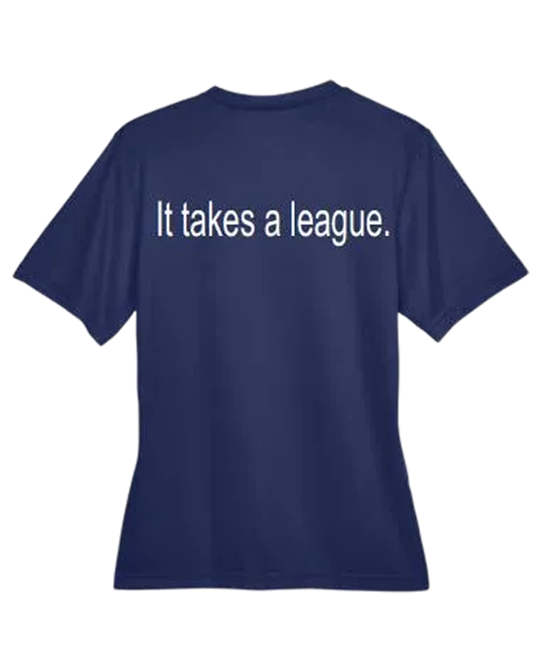 Upgrade your wardrobe with our ladies performance v-neck shirt. Crafted with performance in mind, this stylish shirt is perfect for any occasion. The left chest features our signature logo, showcasing your support for The Reading League. And for an added touch of personality, the back displays a tagline that will inspire others. Stay comfortable and fashionable with our ladies navy v-neck shirt - a must-have addition to your collection.