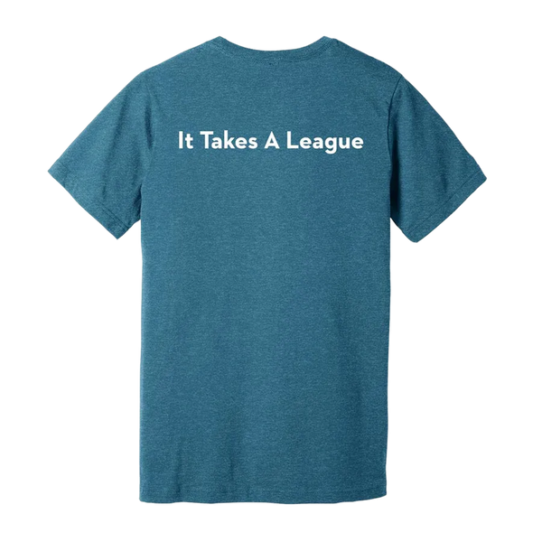 Made with premium quality fabric, this tee ensures comfort and durability. Show off your passion for making a difference while looking effortlessly cool in our Heathered Teal Tee. On the back, you'll find our inspiring tagline "It Takes a League," reminding everyone that together we can make a difference.