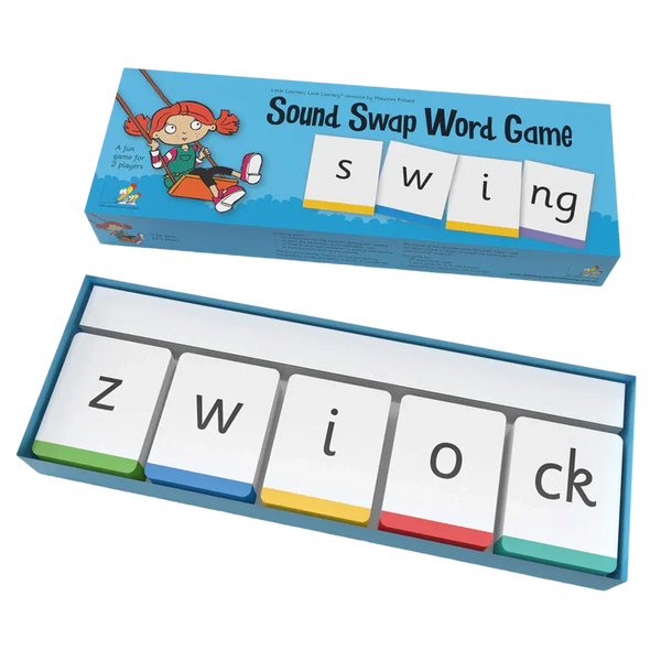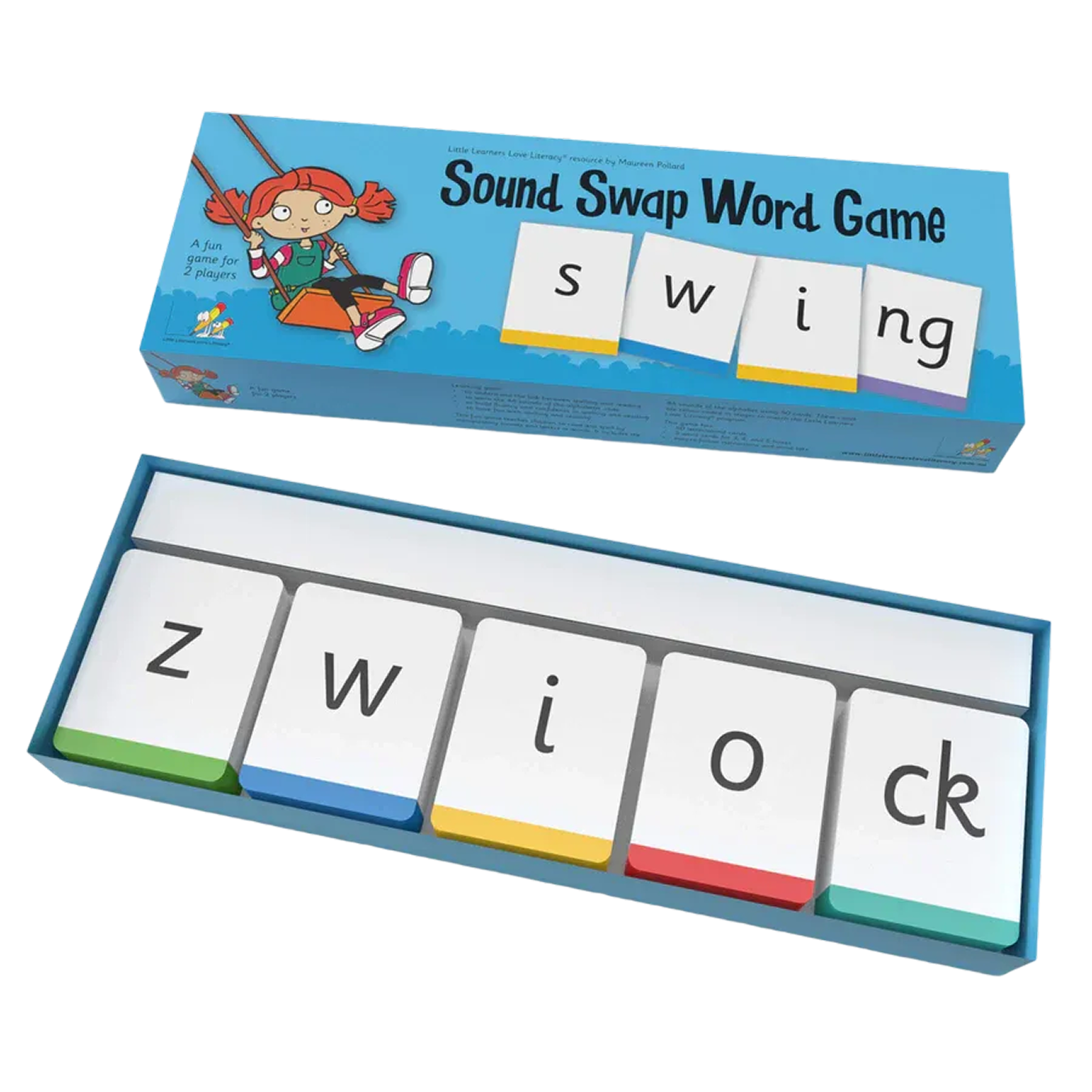 This pack contains everything you need to pick up and play Sound Swap, including a box of 49 letter/sound cards, 3-word building boards and a book of pre-prepared word chains to use. Each letter/sound card is color-coded to match Little Learners Love Literacy® Stages 1-7 making it simple to target your teaching.