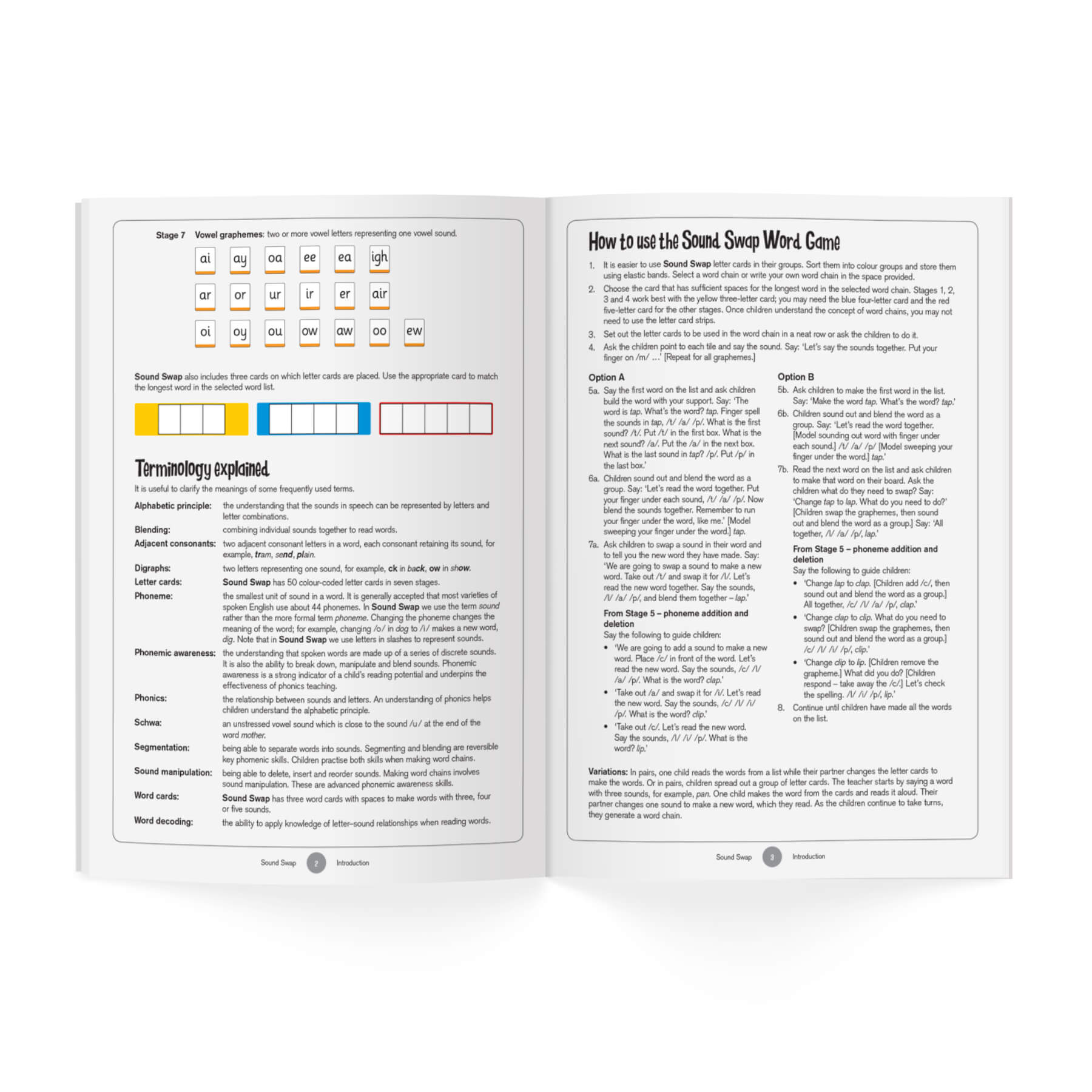 To play Sound Swap, children change one letter/sound card in a word to make a new word in the chain. From Stage 5 the word chains also involve addition and deletion of letter/sound cards to make new words (advanced phonemic awareness skills). The game can be played in two different ways to vary the focus.